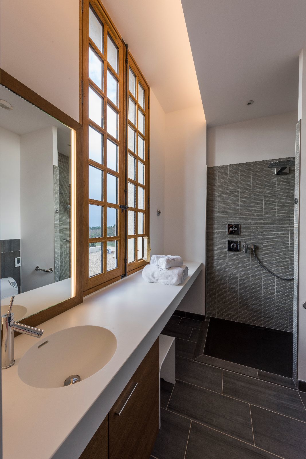 L'idée principale de la rénovation a été de conserver au maximum l'âme de la bâtisse, conserver son aspect ancien, rural et classique. Les éléments contemporains ne sont, dès lors, que très peu visibles de l'extérieur, si ce n'est quelques touches, telle que le béton brut utilisé pour le portail ou le muret de la grande terrasse en façade Sud. Les parties en béton brut sont également recouvertes de pierre taillées de Bordeaux afin de marier ancien et contemporain.
