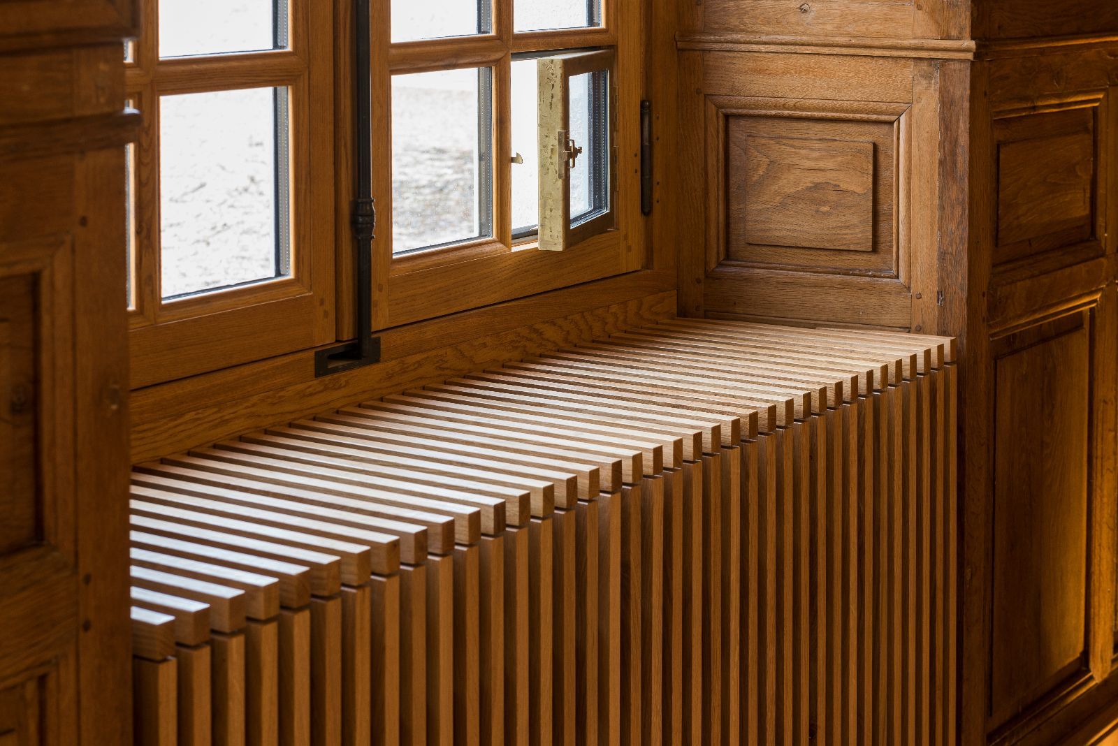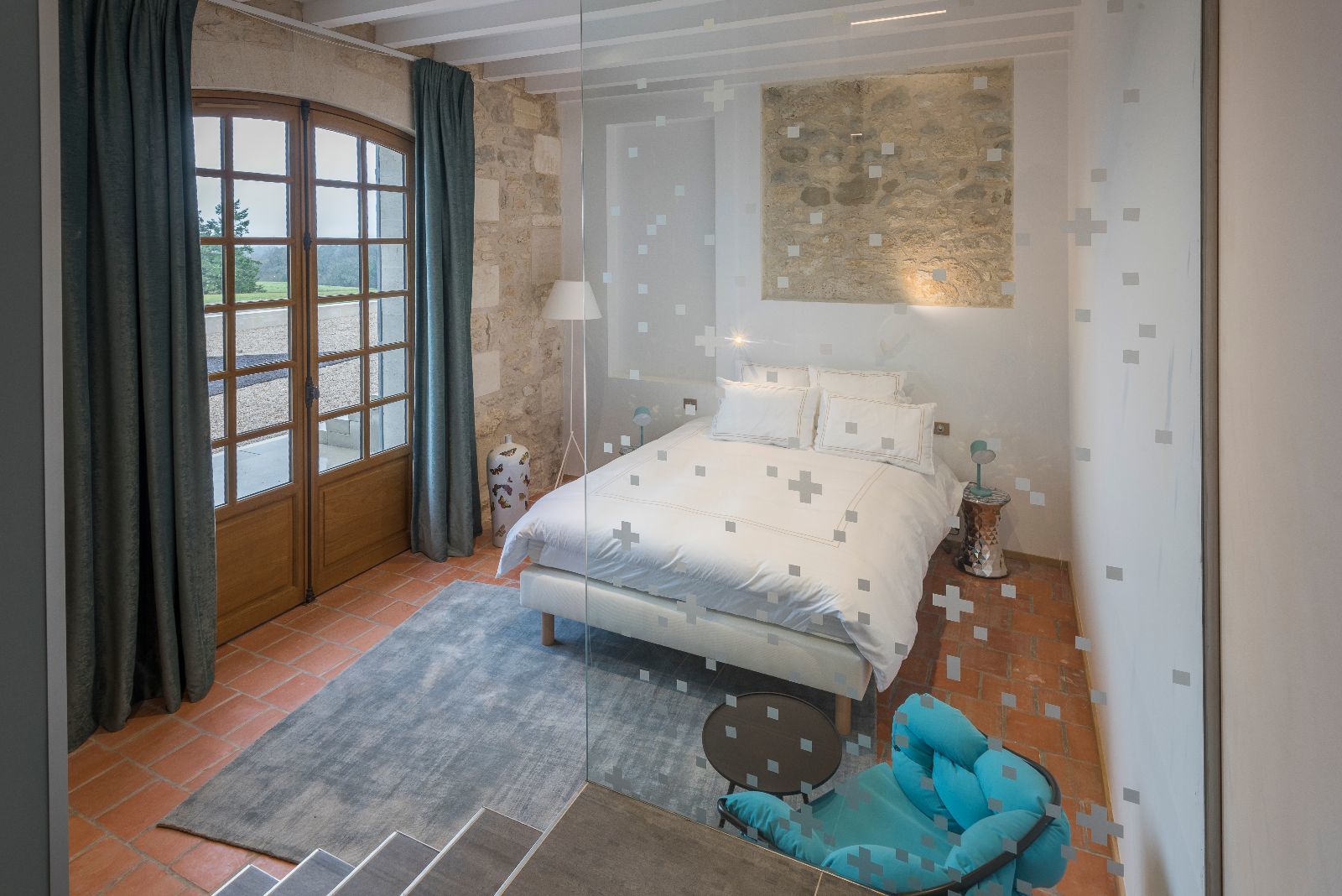 L'ensemble des chambres présente ainsi des murs obliques et des poutres massives également de biais, afin de casser le rythme des pièces. L'objectif est de surprendre, de perturber à la fois le regard et les sens, dans la douceur, pour laisser le temps de la découverte.