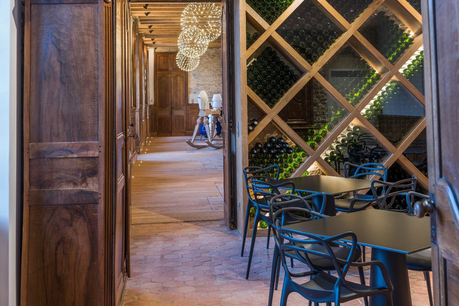 Le premier impact visuel est classique, ancien, mais une seconde lecture plus contemporaine apparait par transparence au travers des vitres, notamment par les éclairages en zigzag visibles en second jour dans le vestibule.