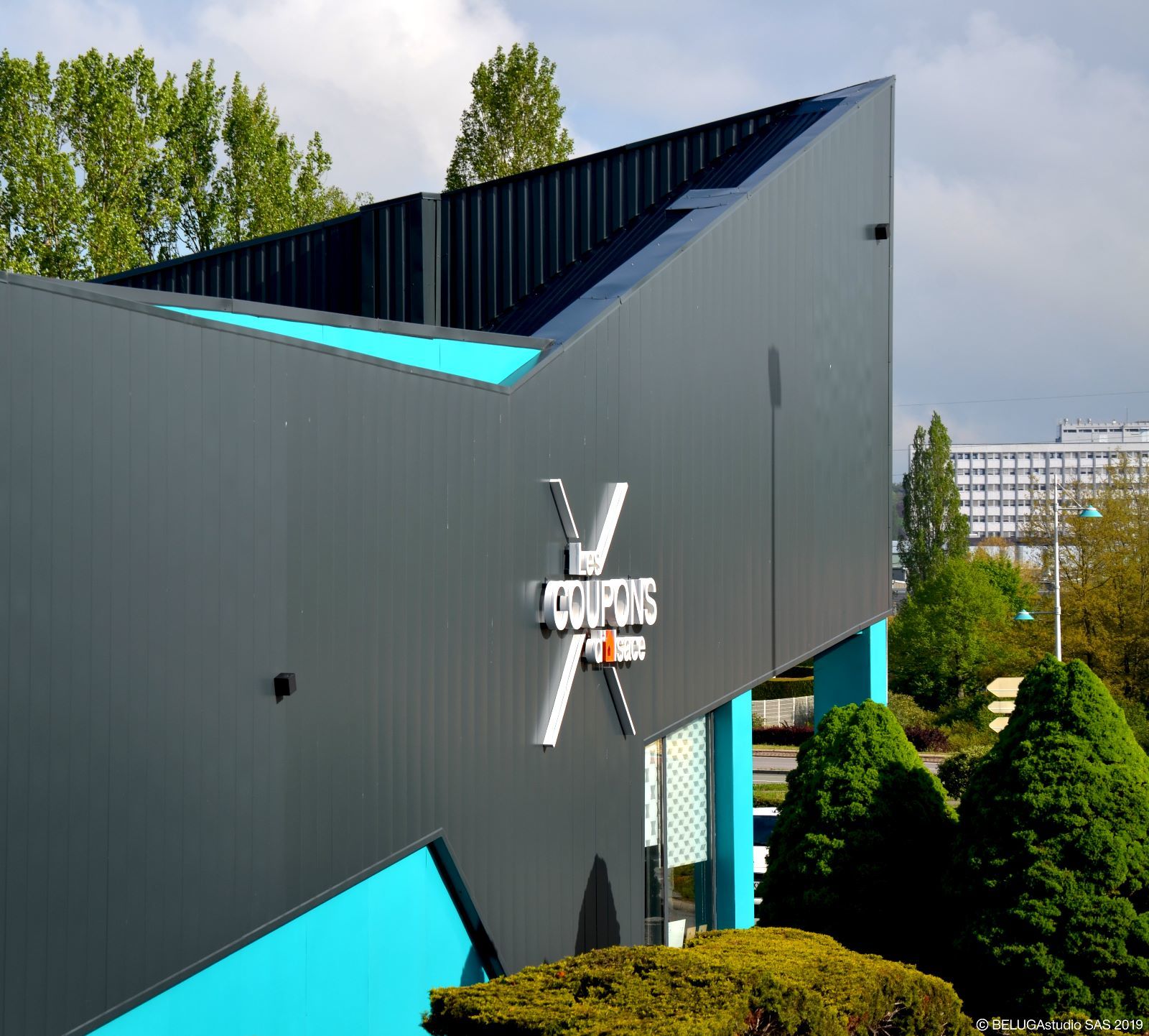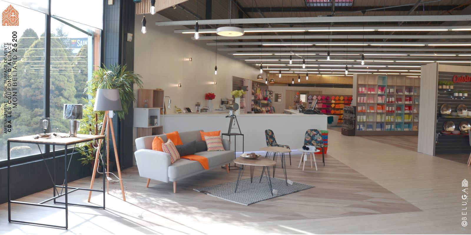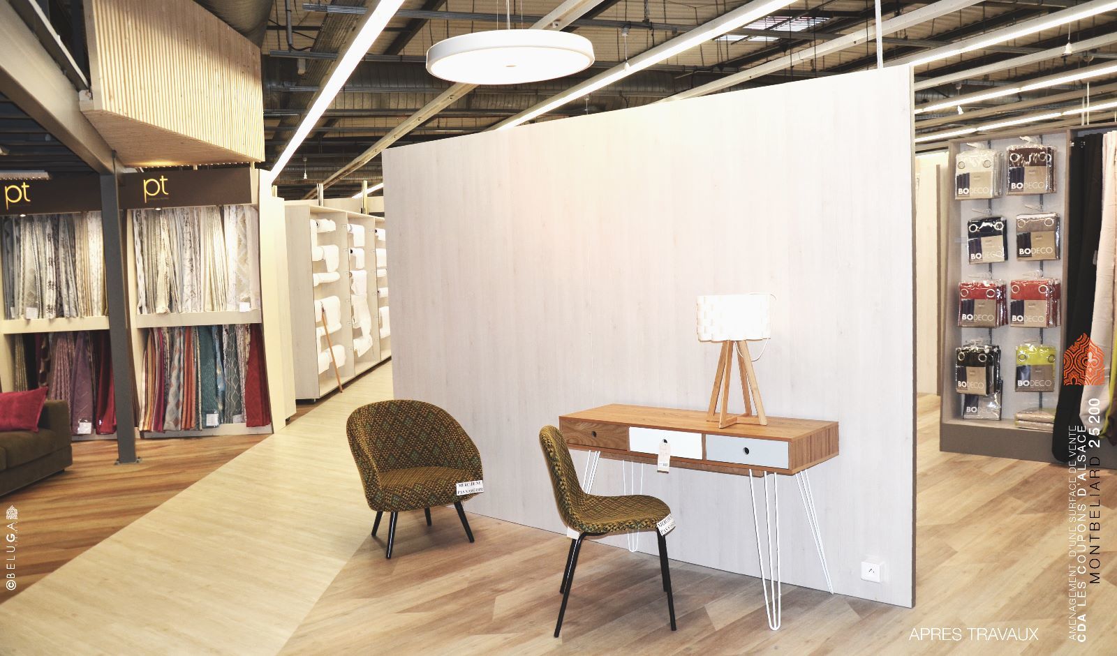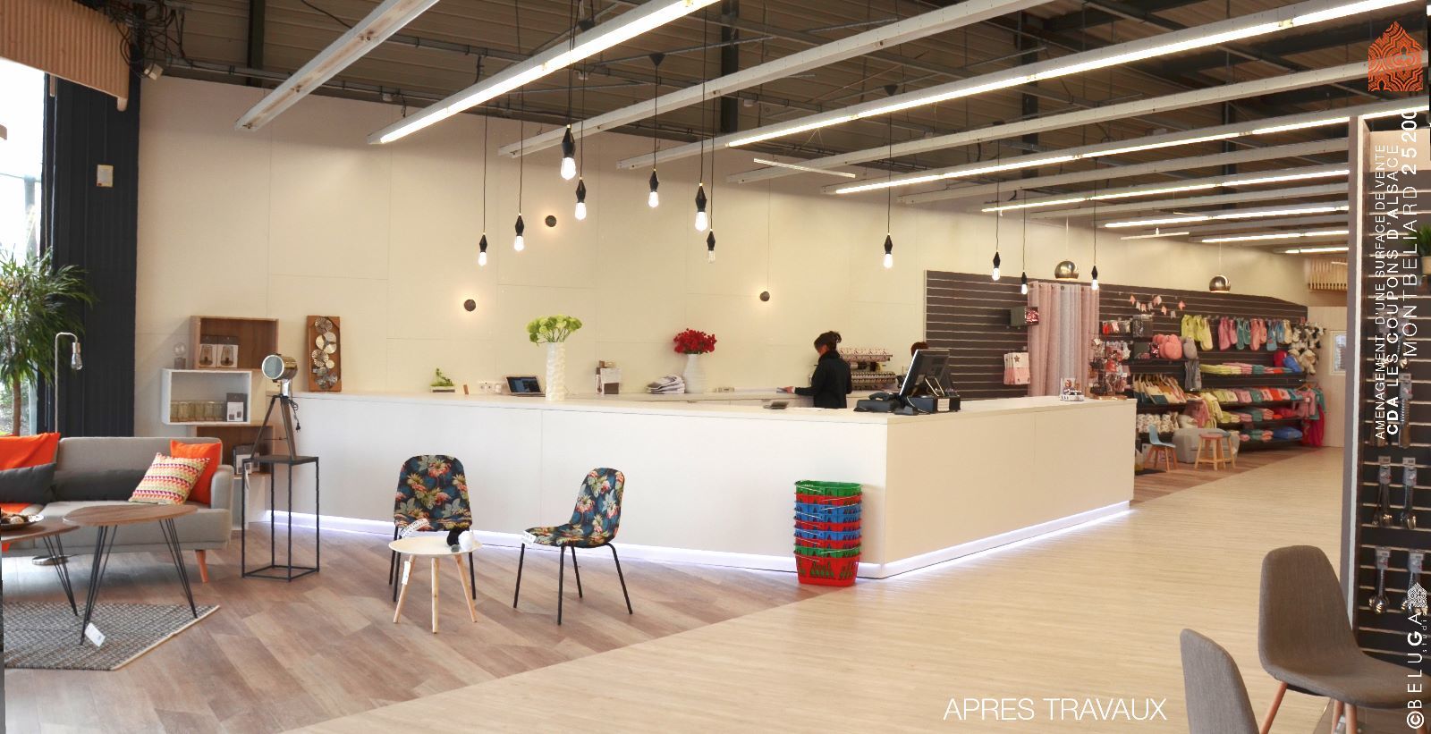 La réfection intérieure du magasin, couplée aux travaux de façades, a mené à la création d'u nouveau logo, qui s'insère et appuie le nouveau dessin du nouveau volume.
